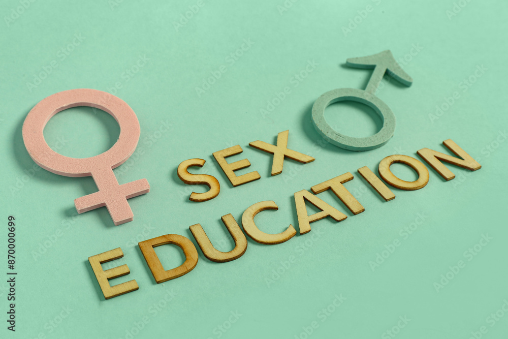 Letters with text SEX EDUCATION, male and female symbols on blue background