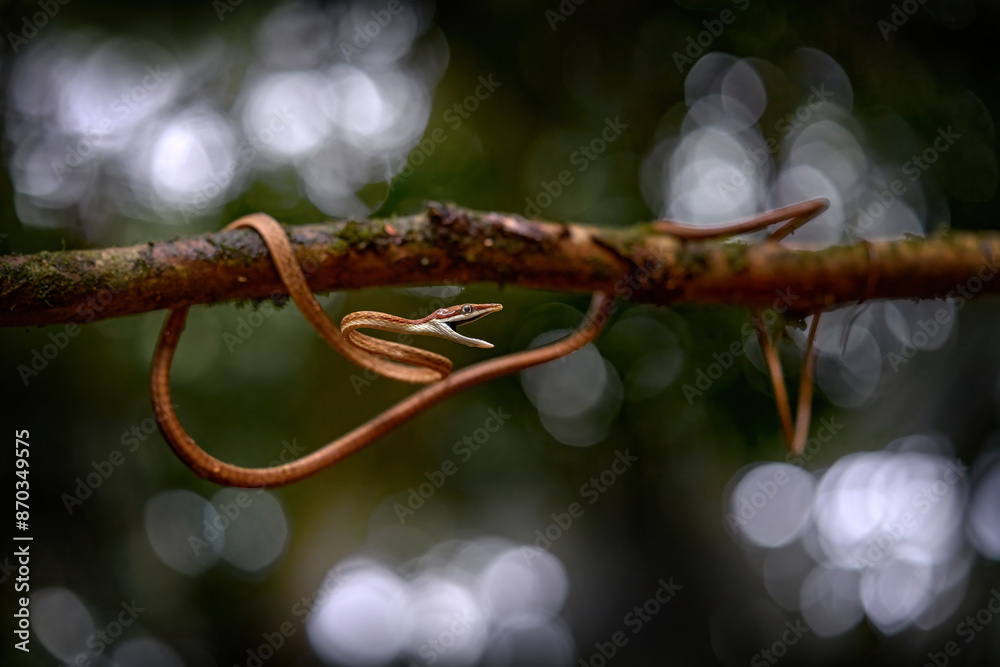 Oxybelis koehleri, Köhler's vine snake, viper looks like shoelace. Slim slader snek with open mouth muzzle. Angry reptile in nature habitat, dark green tropic forest, Costa Rica. Bootlace, wildlife.