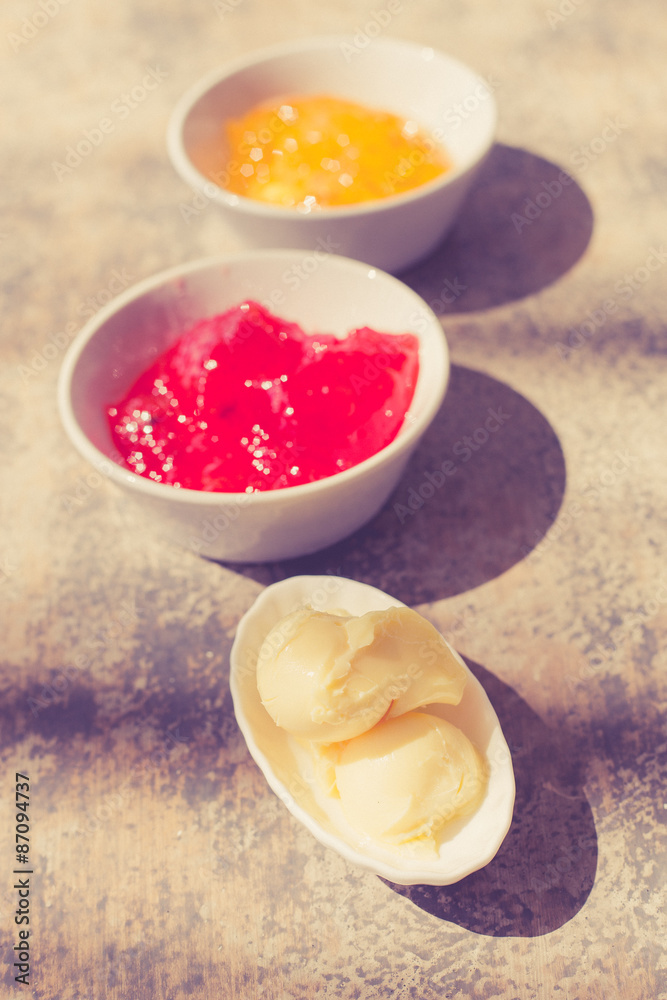 Strawberry jam, Pineapple Jam and Butter in a white bowl - shall