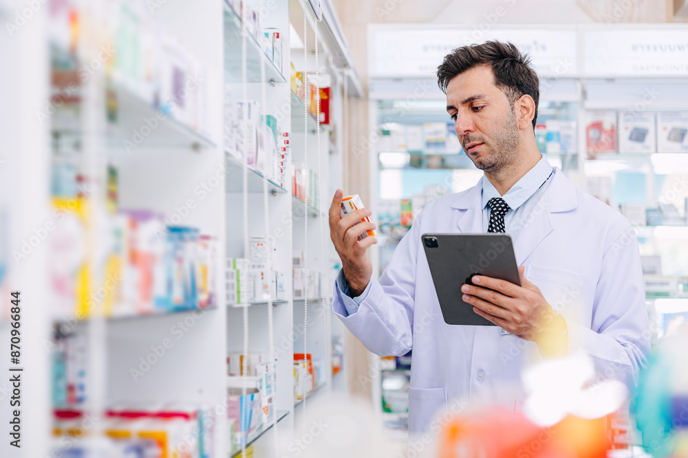 Pharmacy shop manager male staff looking medicine detail at drugstore, checking products description label with wireless tablet computer.