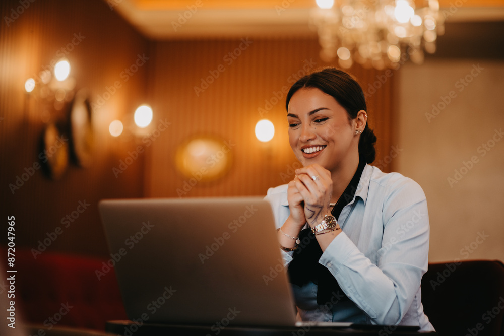 Radiant Latina businesswoman confidently leads business meeting over coffee.