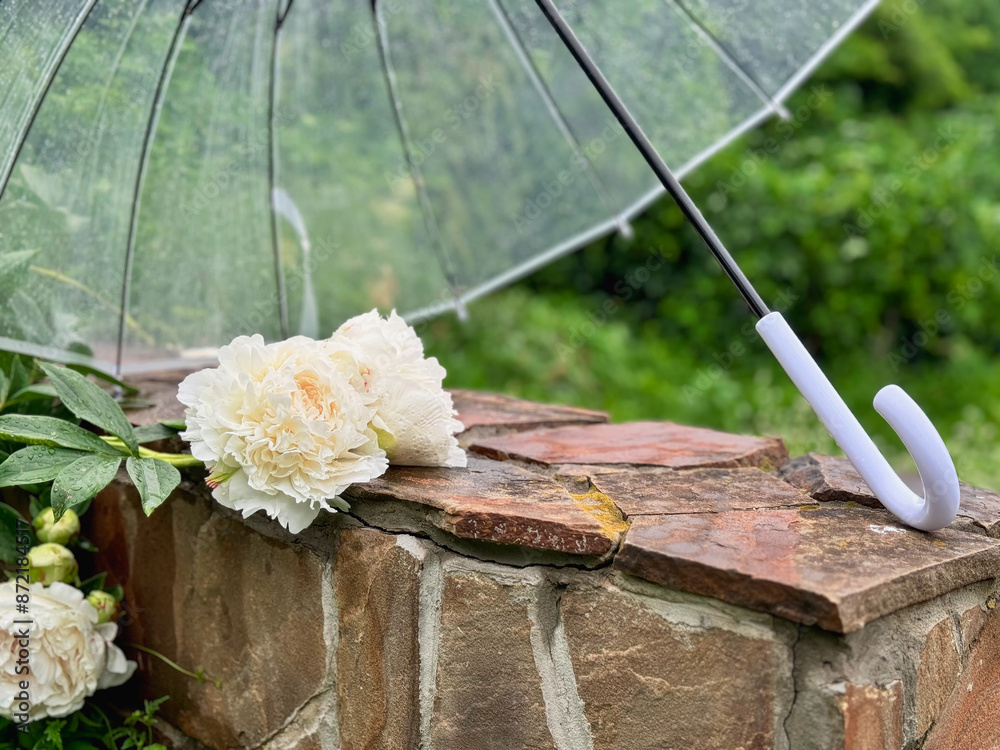 Fragrant white peonies under an umbrella. rainy season