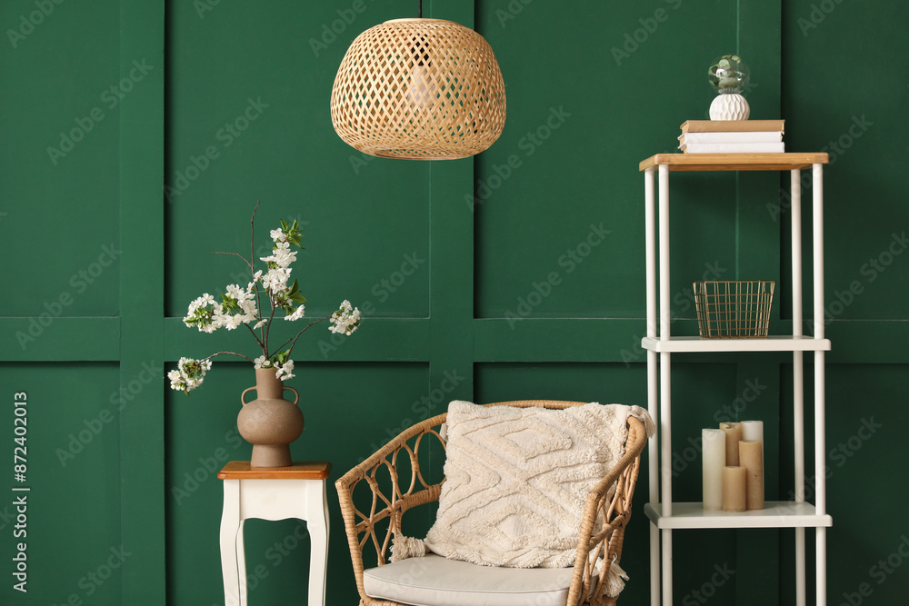Vase with blooming branches on coffee table near cozy armchair in green living room