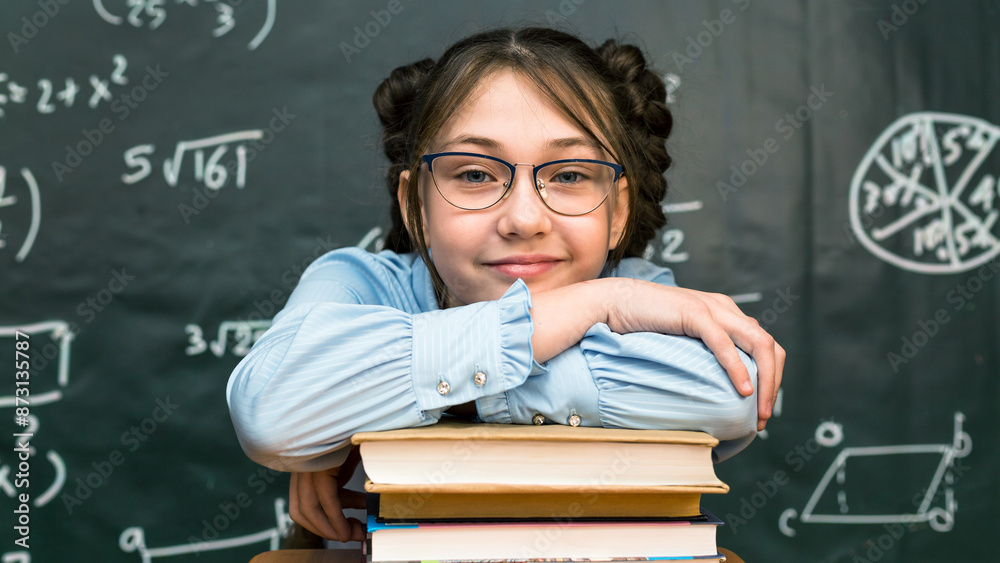 A schoolgirl girl put her hands and head on a stack of books in a school class.
