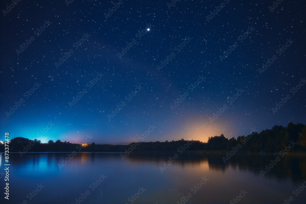 Night Stars Above Lake. Natural Starry Sky Background Backdrop Landscape