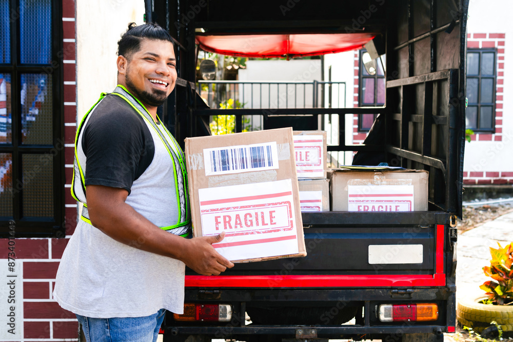 A Latino man working in a delivery company carries cardboard boxes labeled "Fragile," smiling at the camera in profile. Next to him is a three-wheeled motorized vehicle or cargo tricycle