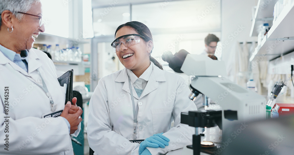 Women, laboratory and happy for science talk with technology for research, teamwork or support for pharma. Female leader, scientist or collaboration with mentor for medical innovation or breakthrough