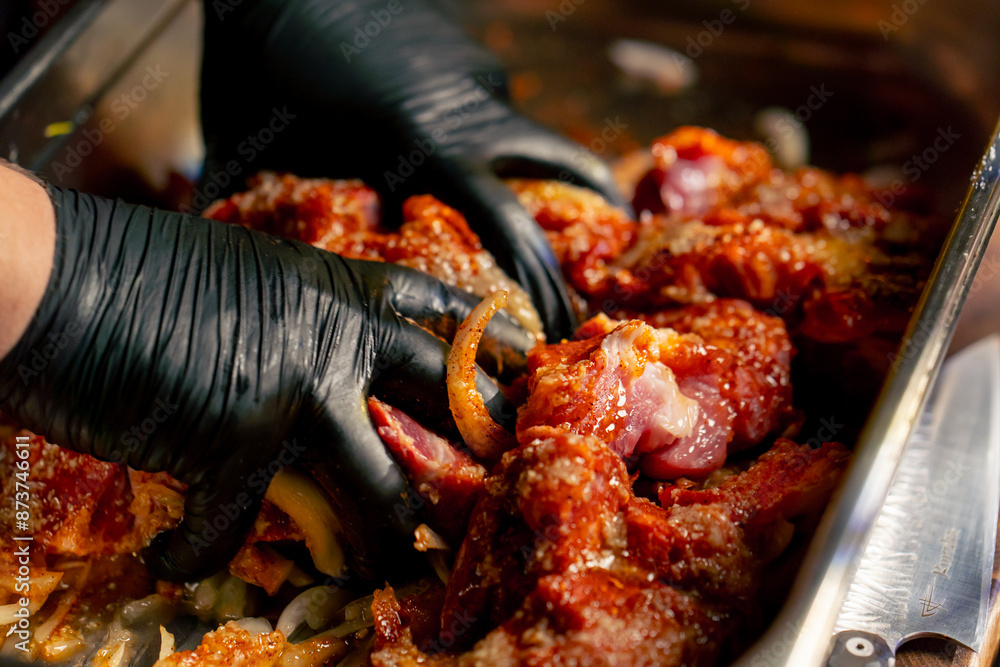 close up in a restaurant in a rib bar in the central hall chef in black gloves kneads meat in a marinade, good impregnation