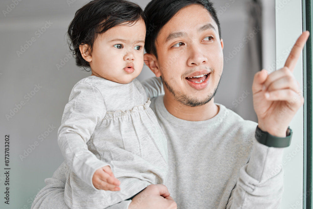 Father, baby and talking by window together, bonding and communication for love in relationship. Man, daughter and speaking to practice speech for child development, growth and childcare in home