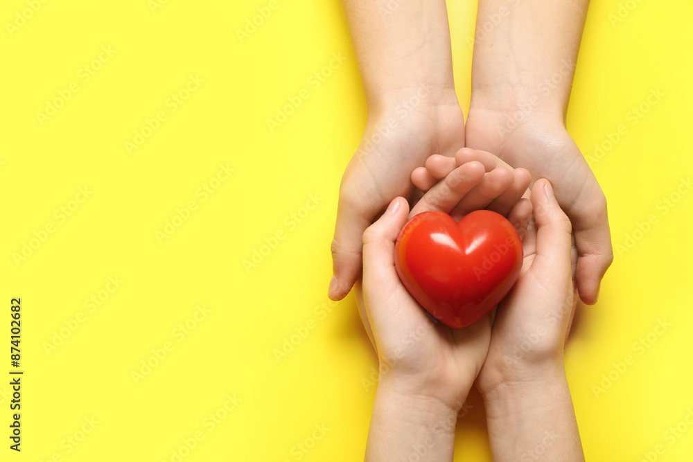 Hands of woman and child with red heart on yellow background