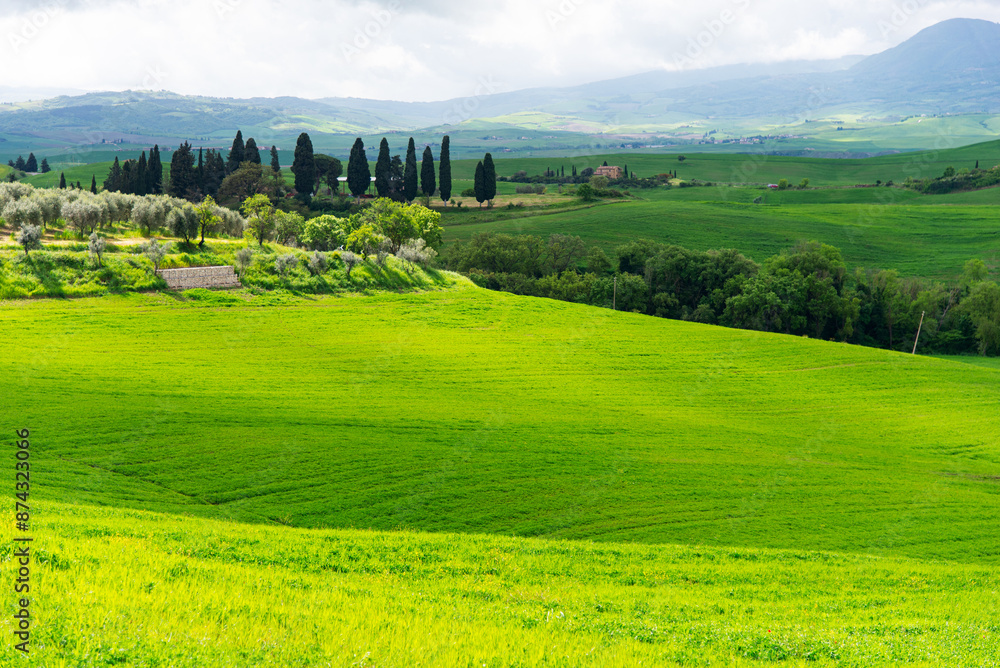 Tuscany, Italy-April 22, 2024: Rolling Green Hills in the Tuscan Countryside