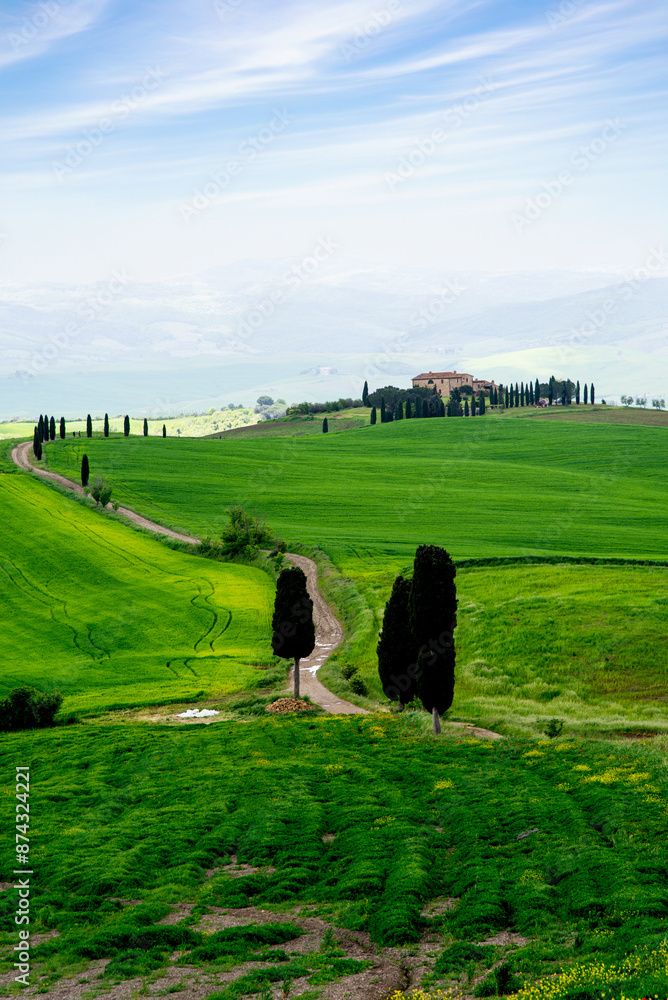 Tuscany, Italy-April 22, 2024: Cypress-Lined Path in Rolling Tuscan Hills