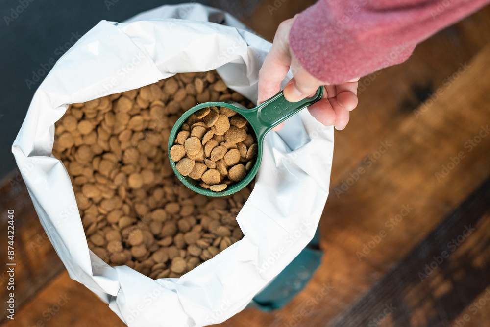 Hand removing a green measuring cup full of dog or cat food kibble from a white bag full of round pieces of food.