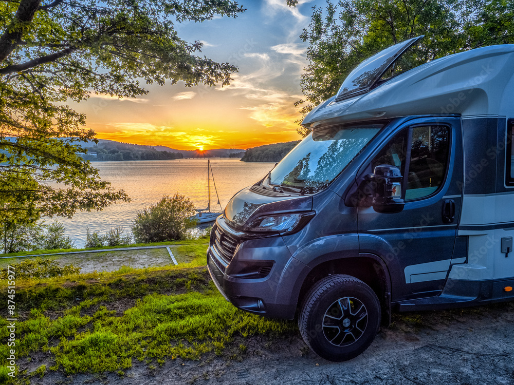Sunset over Lac de Vassivière - Motor Home at Sunset by the Lake