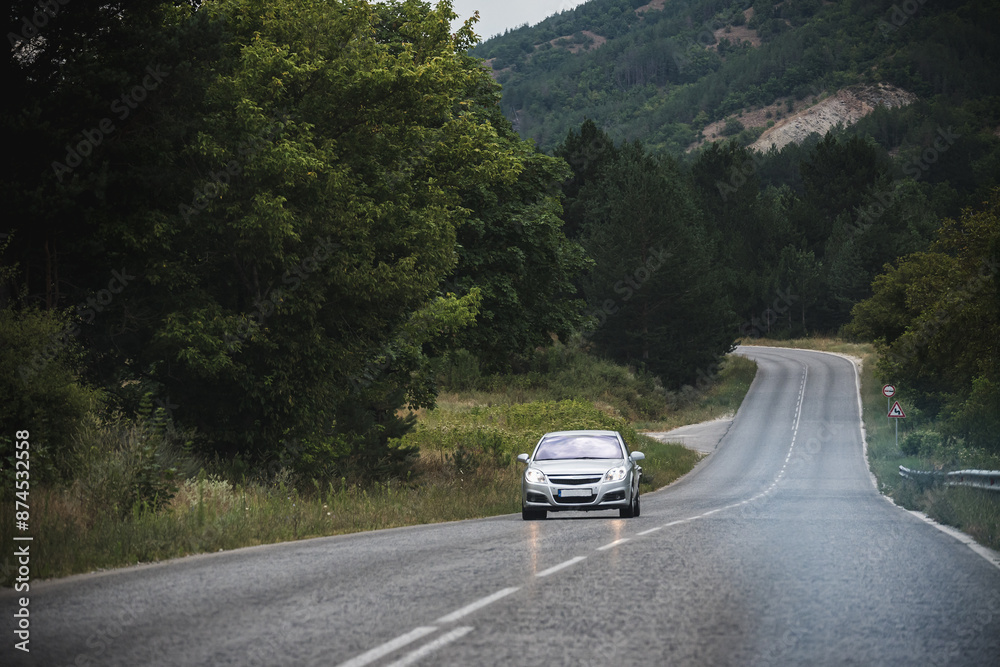 Cars drive along the highway that passes through the beautiful mountainous region of Bulgaria