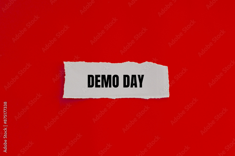 Demo day message written on ripped torn paper piece with red background. Conceptual demo day symbol. Copy space.
