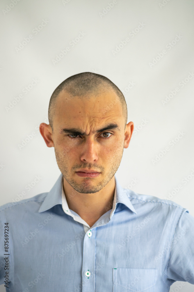 Young man with shaved head in a bad mood raising an eyebrow in disapproval