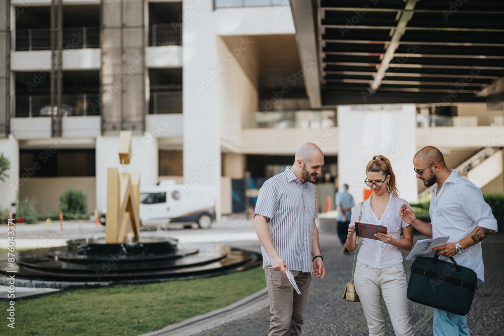 Team of marketing workers in an outdoor meeting analyzing campaign performance, market trends, and strategy development.
