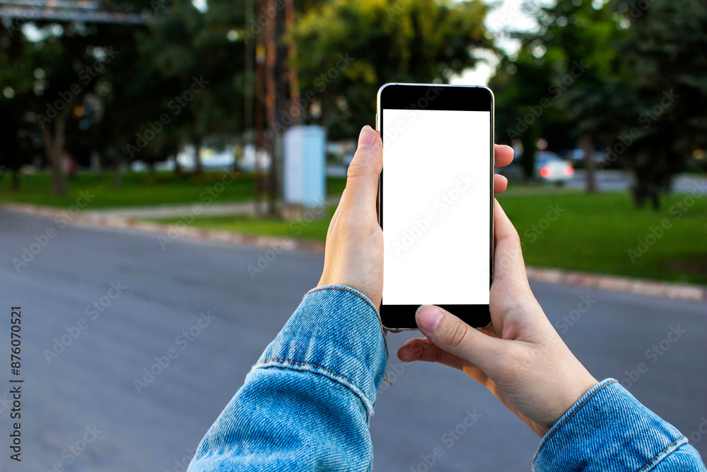 Hand holding blank screen smartphone at the outdoor, mockup phone, transparent background png