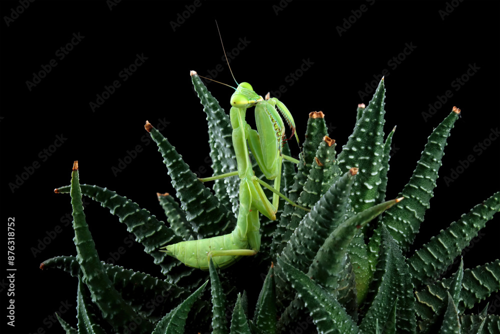 The praying mantis on leaves, praying mantis on branch with black background, Green Praying Mantis