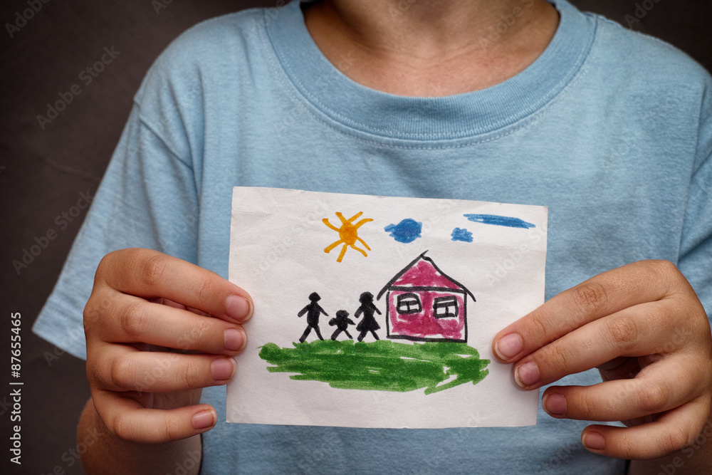 Child holds a drawn house with family