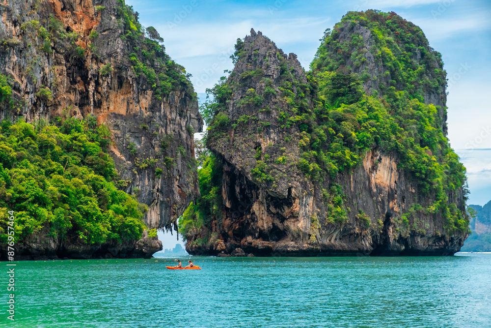 Rocky island on Phra Nang beach, Railay Bay, Krabi, Thailand. People kayaking between tropical cliffs. Summer vacation and holiday background