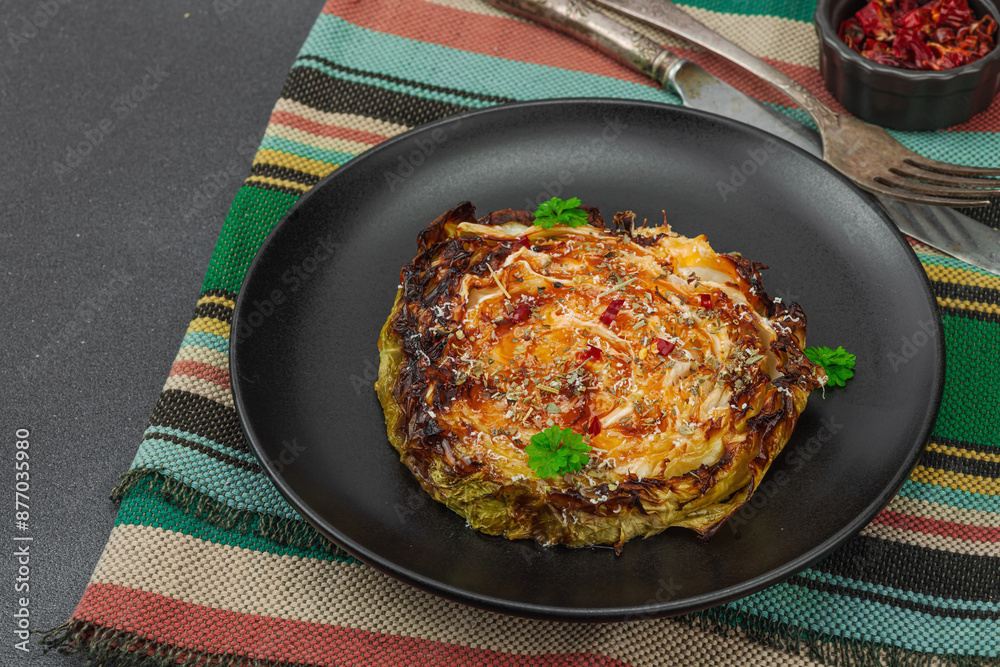 Homemade vegan cabbage steaks with herbs and spices. Healthy food ready to eat on a serving plate