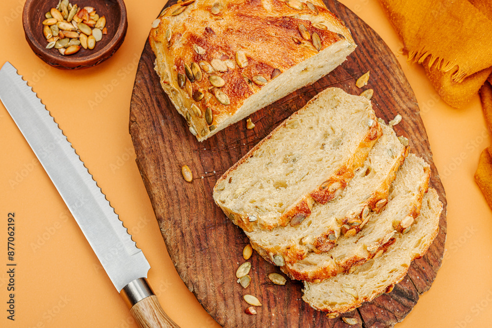 Fresh bread with pumpkin seeds. Home baking concept. Autumn decor