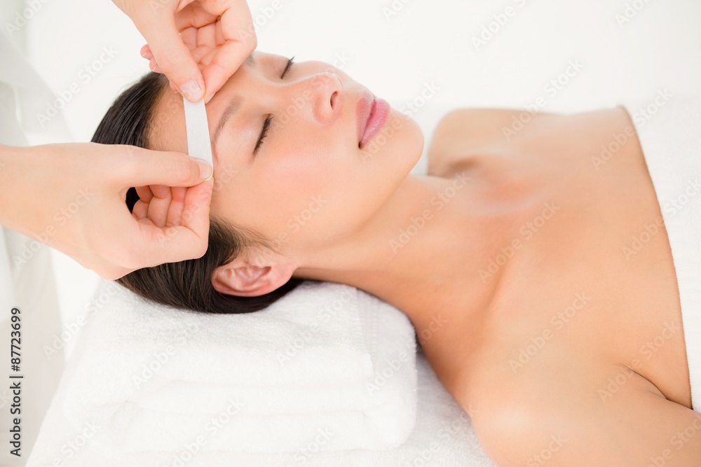 Hand waxing beautiful womans eyebrow