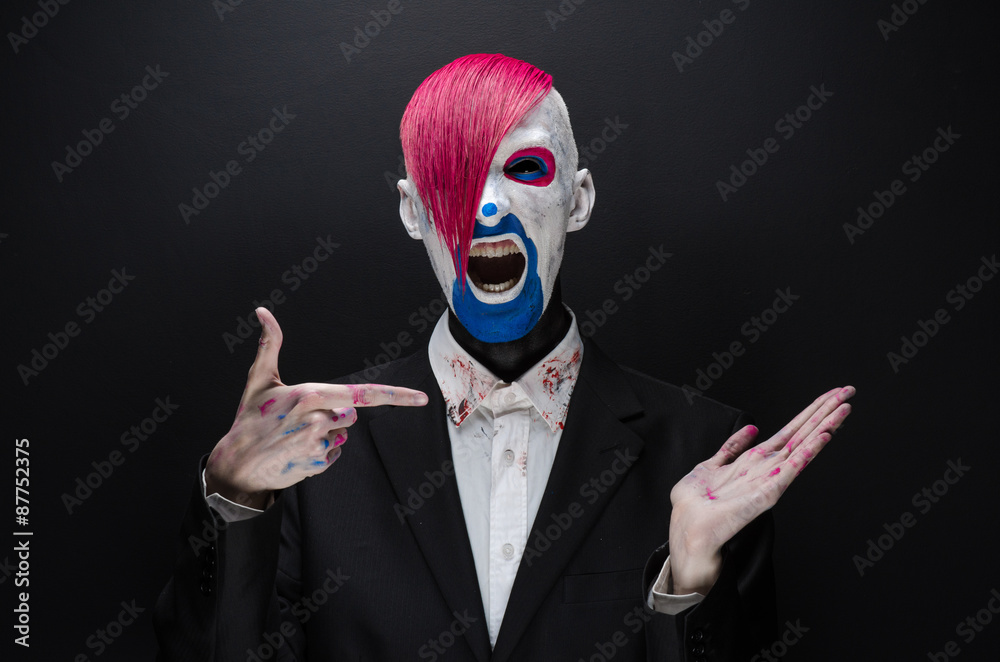 Clown and Halloween theme: Scary clown with pink hair in a black jacket on a dark background in the studio