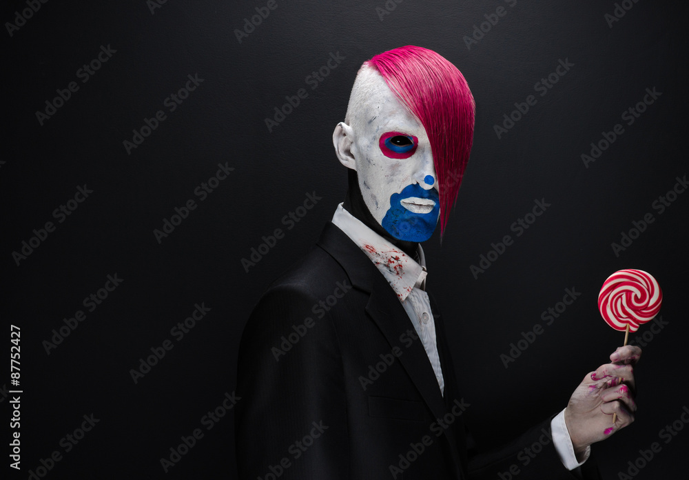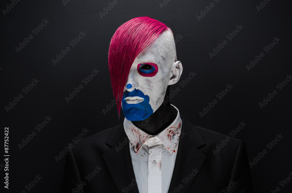 Clown and Halloween theme: Scary clown with pink hair in a black jacket on a dark background in the studio