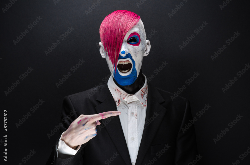 Clown and Halloween theme: Scary clown with pink hair in a black jacket on a dark background in the studio