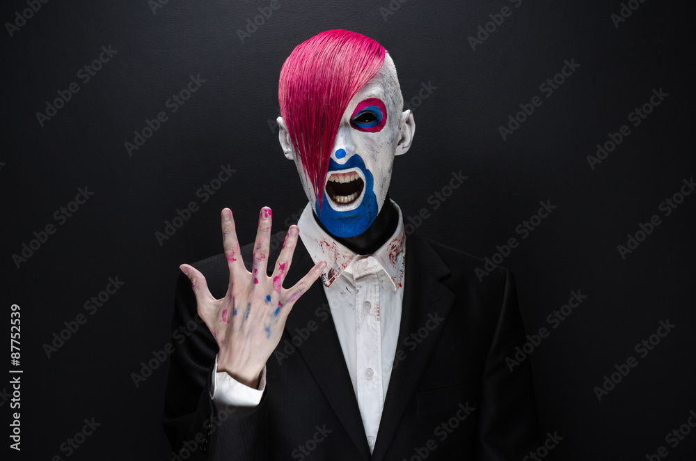 Clown and Halloween theme: Scary clown with pink hair in a black jacket on a dark background in the studio
