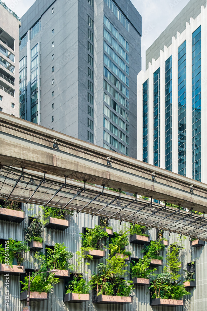 Vertical garden with lush green plants on urban building facade, framed by modern skyscrapers and metro bridge in Kuala Lumpur city, Malaysia. Sustainable modern and ecological architecture