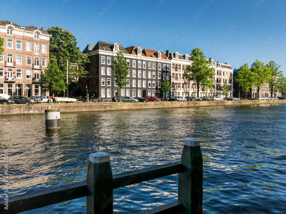 Old houses on Houtmankade alongside West Canal in Amsterdam, Netherlands
