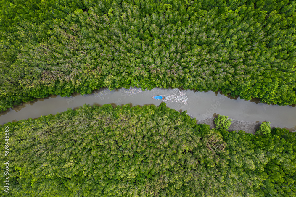 Aerial view of green mangroves or tropical forest in Thailand.