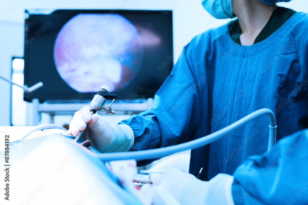veterinarian doctor in operation room for laparoscopic surgical take with art lighting and blue filter