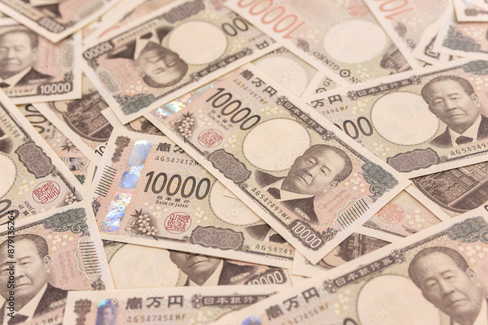 Japan's new banknotes. Image of a large number of 10,000 yen notes laid out.