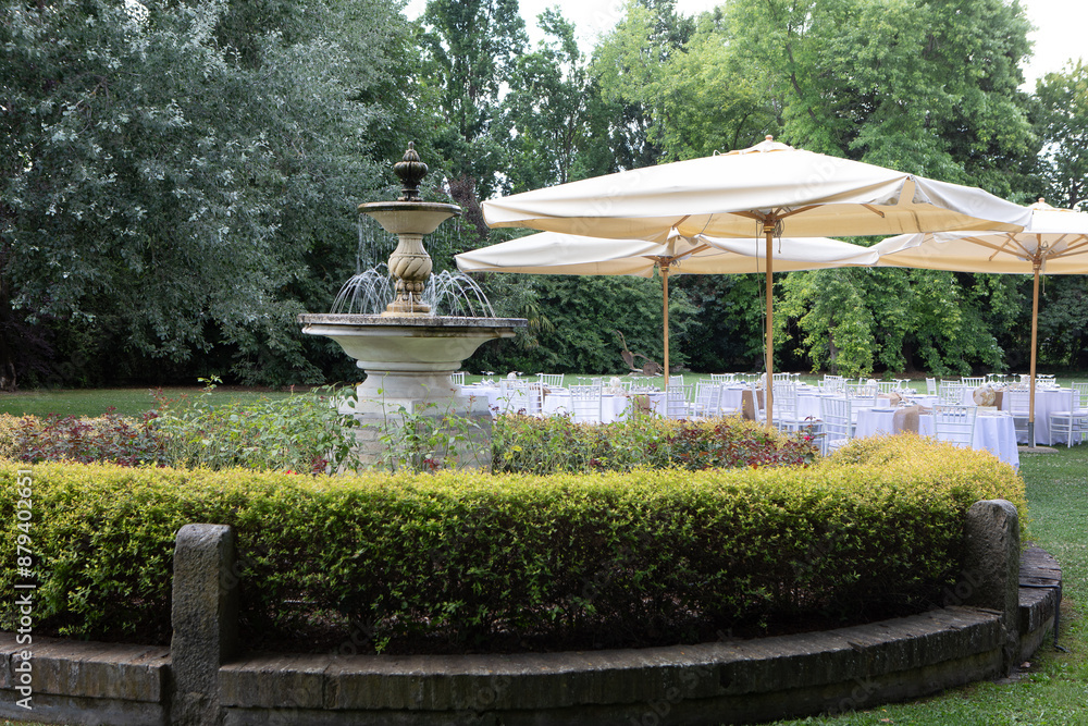 Luxurious garden wedding venue featuring elegant tables and fountain