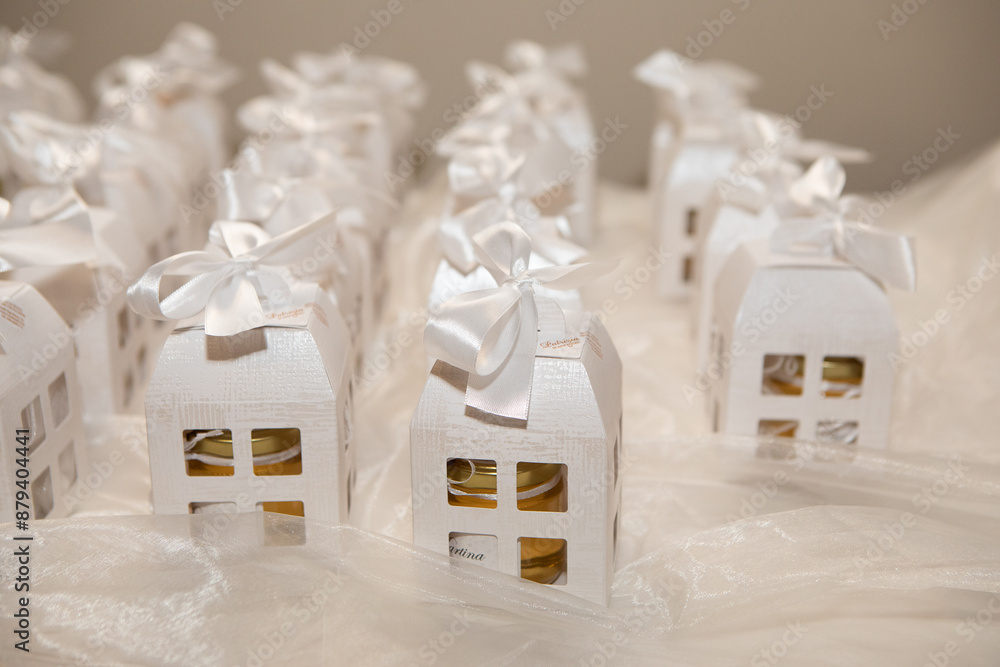Wedding favors with white satin ribbons are displayed on white organza fabric