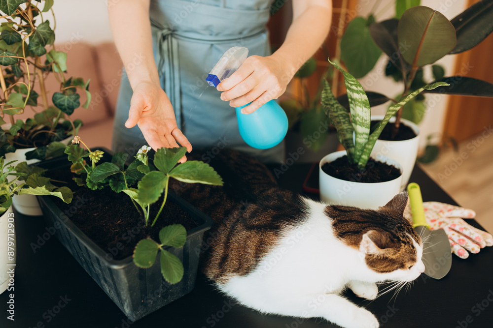Home gardening with your pet. Cropped unrecognizable Woman with cat transplanting a green houseplant into a new pot. Web banner. Florist works and sprays aquatic plants.