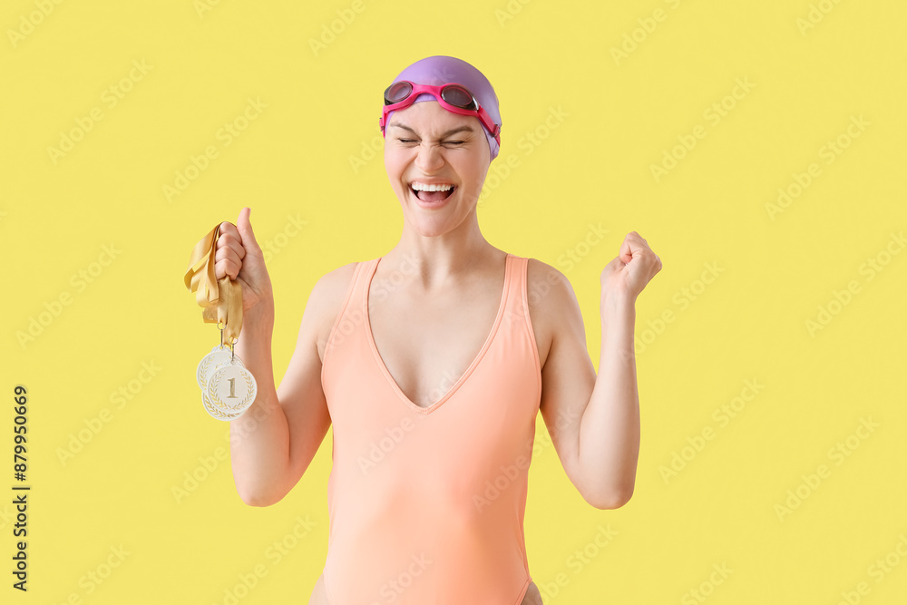 Happy young female swimmer with first place medals celebrating success on yellow background
