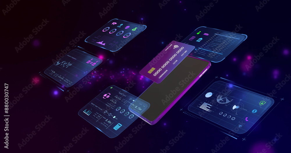Image of data processing with credit card and smartphone over light spots on black background