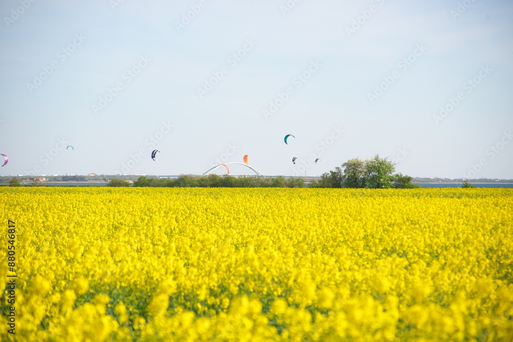 Kitedrachen Fehmarnsundbrücke und Rapsfeld