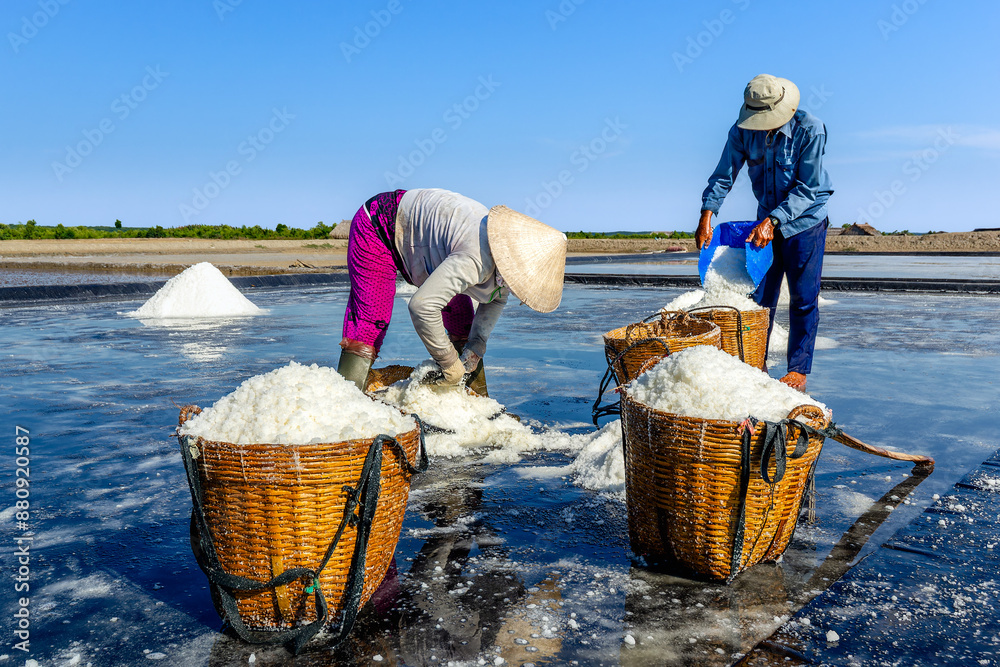 Farmers are harvesting salt in their fields in Can Gio district of Ho Chi Minh City, Vietnam.