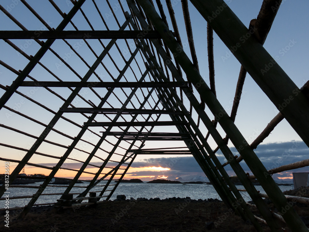 Silhouette of rack for drying stockfish at sunset, near Henningsvaer on Lofoten Islands, Norway