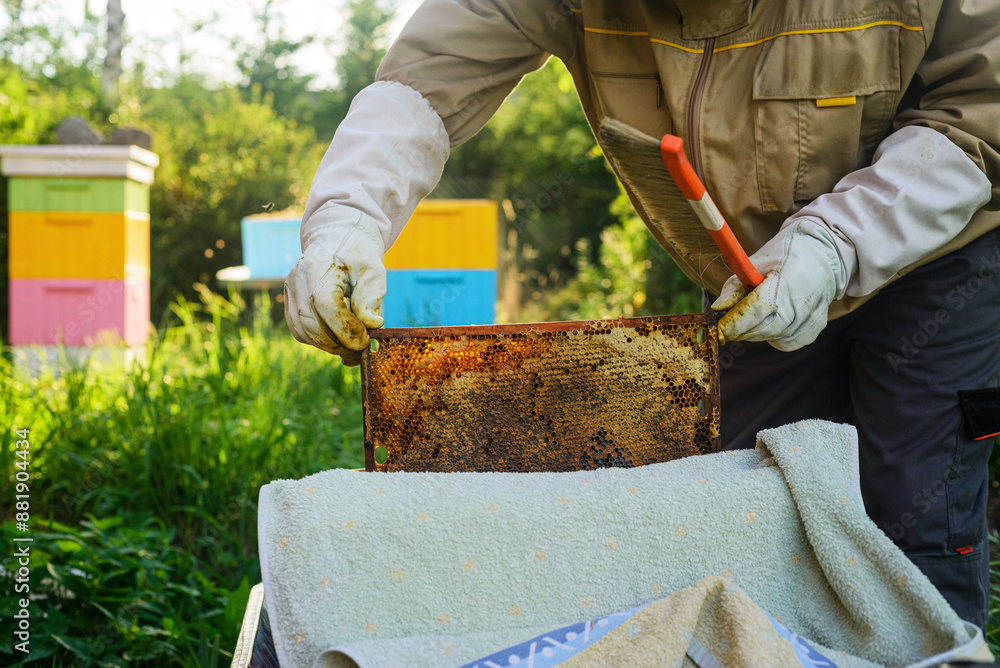Pszczelarz z plastrem miodu przy otwartym ulu. Produkcja miodu. Ekologiczna pasieka. Zdrowe odżywianie, Tradycyjna, lokalna produkcja miodu