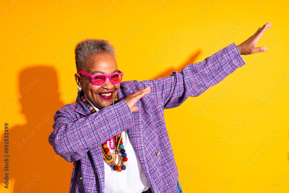 Colorful portrait of funny senior black woman wearing stylish clothing isolated in studio - Cool modern old female adult, concepts about elderly, senior people and body positive