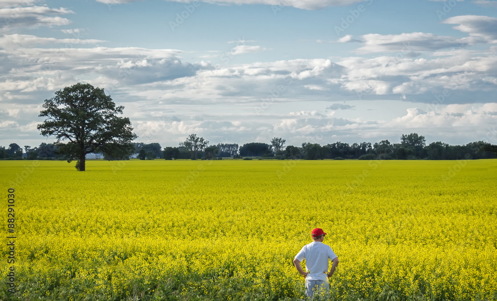 horizontal image of a farmer with red hat standing at the edge of his yellow canola field gazing across his crop under a cloudy blue sky in the summer.