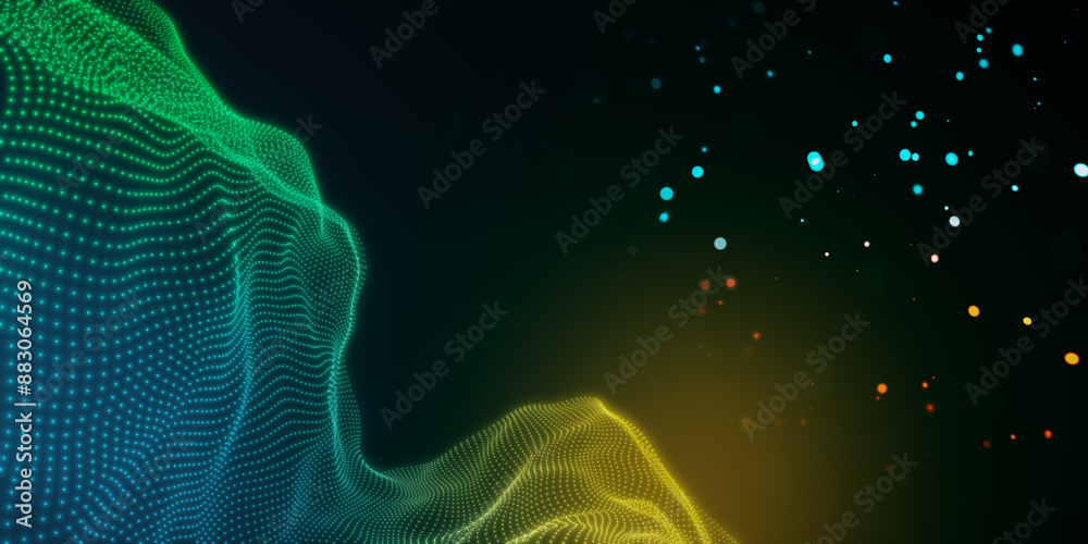 Abstract digital wave of glowing particles on dark background, concept of technology and dynamic motion. 3D Rendering